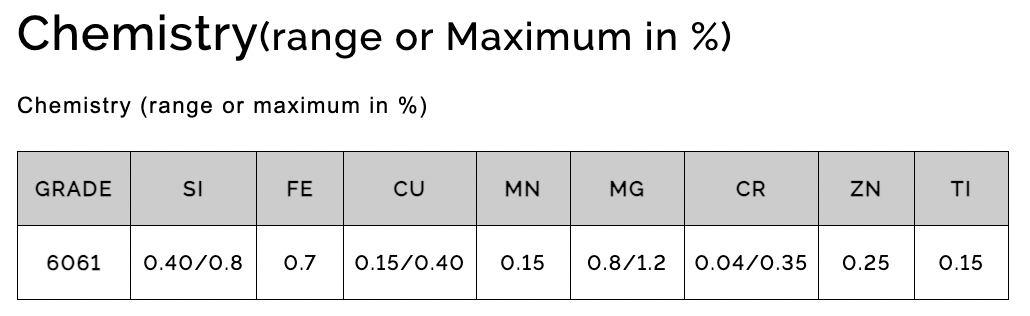 SPECIFICATIONS: GRADE ALUMINUM 6061, UNS A96061