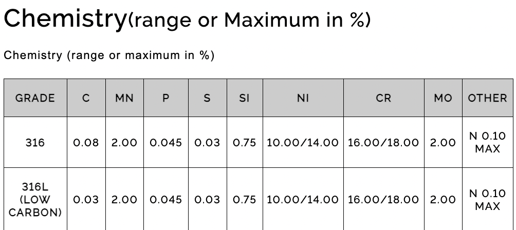 SPECIFICATIONS: GRADE STAINLESS STEEL 316/316L, AISI 316, UNS S31600, UNS S31603